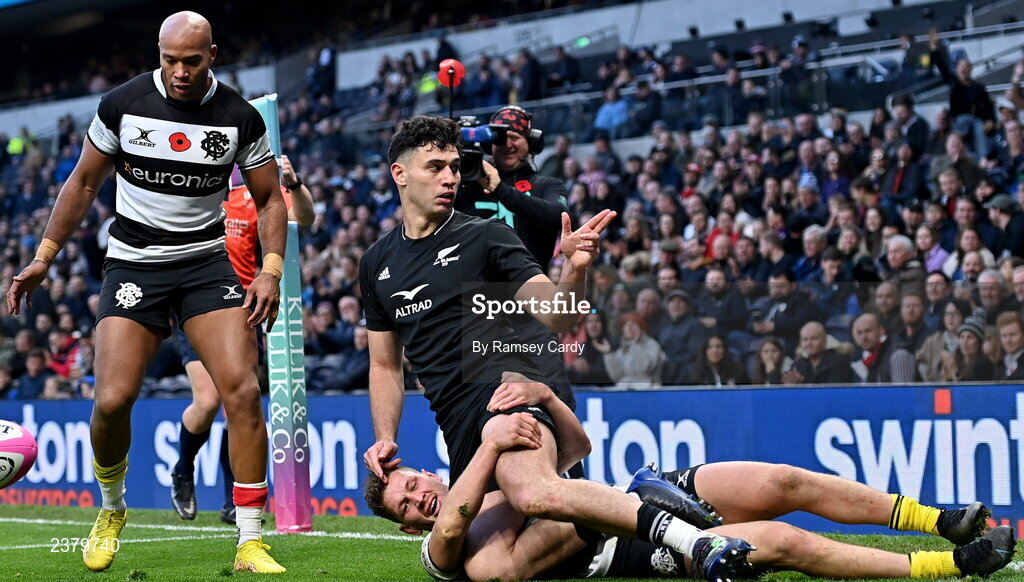13 November 2022; Shaun Stevenson of All Blacks XV celebrates after scoring a try during the Killik Cup match between Barbarians and All Blacks XV at Tottenham Hotspur Stadium in London, England. Photo by Ramsey Cardy/Sportsfile