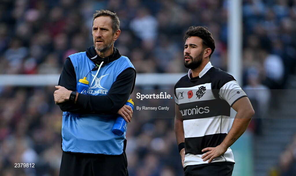 13 November 2022; Antoine Hastoy of Barbarians and coach Will Greenwood during the Killik Cup match between Barbarians and All Blacks XV at Tottenham Hotspur Stadium in London, England. Photo by Ramsey Cardy/Sportsfile