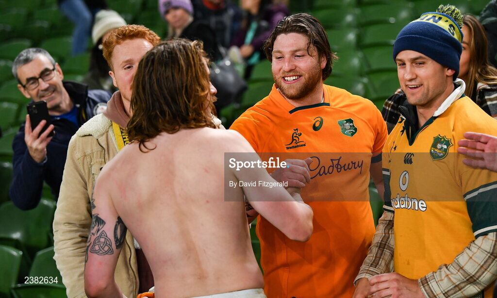 19 November 2022; Mack Hansen of Ireland with Australia supporters after the Bank of Ireland Nations Series match between Ireland and Australia at the Aviva Stadium in Dublin. Photo by David Fitzgerald/Sportsfile