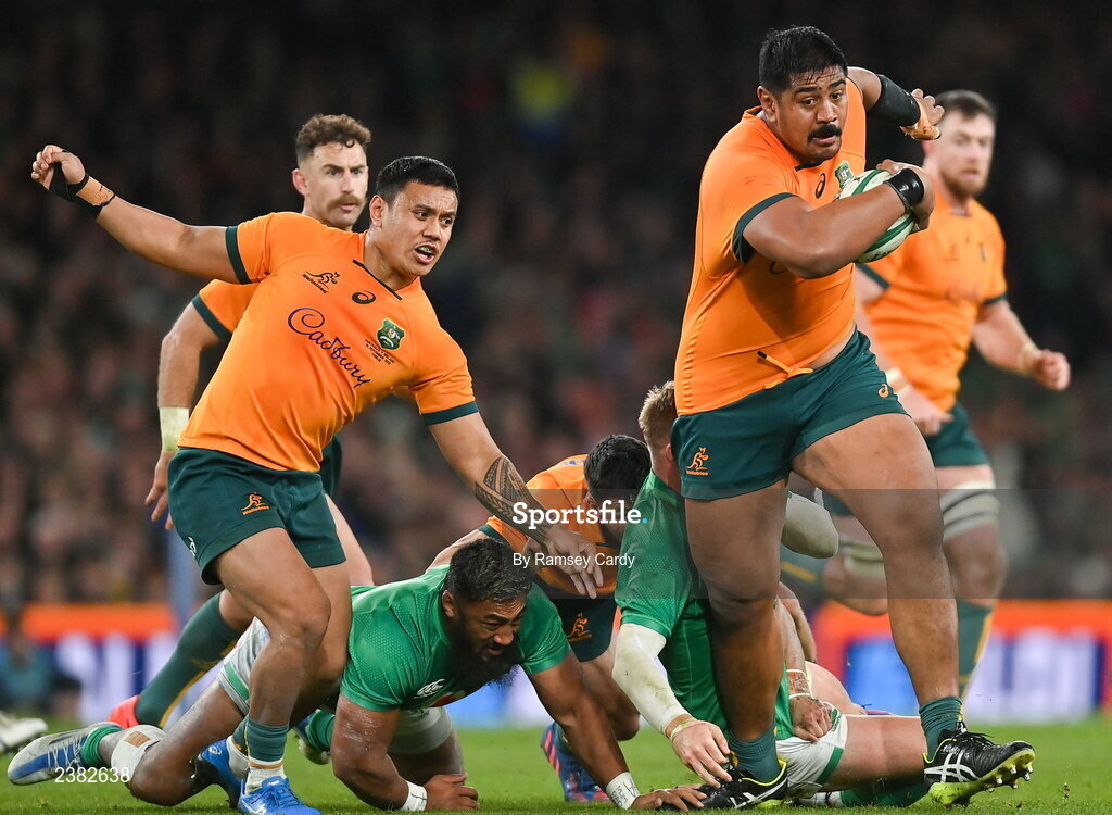 19 November 2022; Will Skelton of Australia is tackled by Jack Crowley of Ireland during the Bank of Ireland Nations Series match between Ireland and Australia at the Aviva Stadium in Dublin. Photo by Ramsey Cardy/Sportsfile