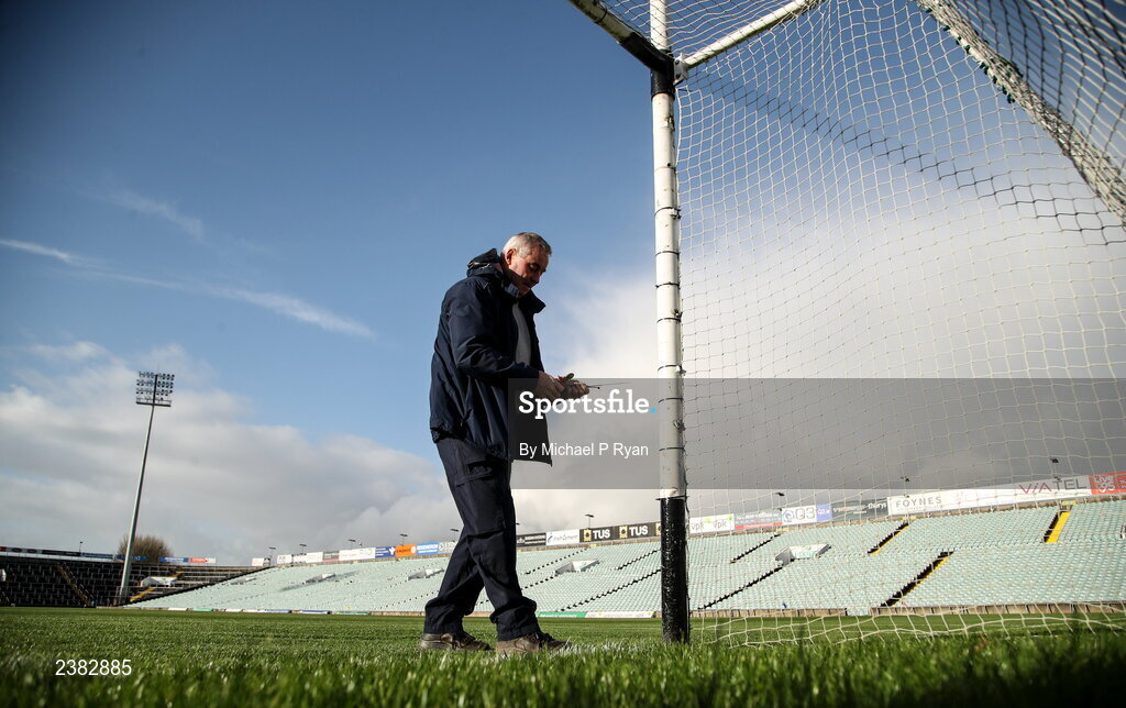 20 November 2022; Groundsman Eugene Griffin tends to the goal netting before the AIB Munster GAA Hurling Senior Club Championship Semi-Final match between Na Piarsaigh and Ballygunner at TUS Gaelic Grounds in Limerick. Photo by Michael P Ryan/Sportsfile