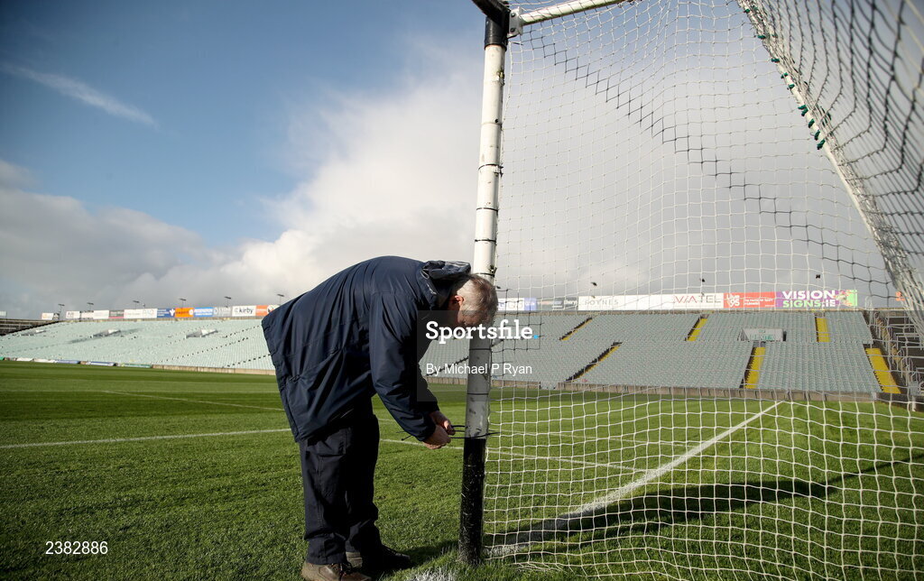 20 November 2022; Groundsman Eugene Griffin tends to the goal netting before the AIB Munster GAA Hurling Senior Club Championship Semi-Final match between Na Piarsaigh and Ballygunner at TUS Gaelic Grounds in Limerick. Photo by Michael P Ryan/Sportsfile