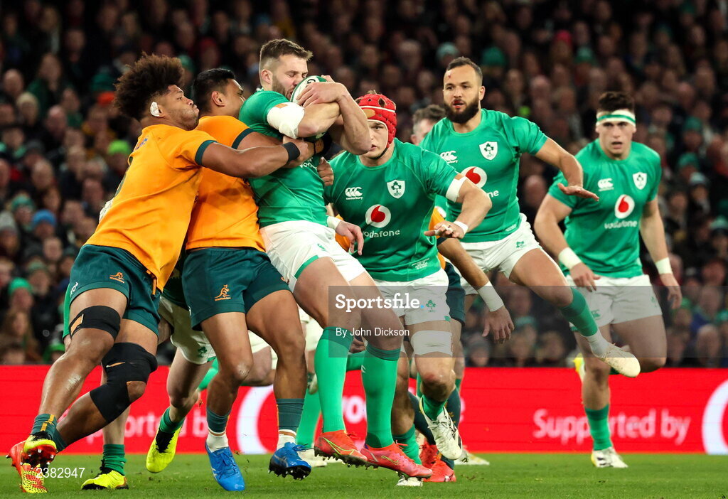 19 November 2022; Stuart McCloskey of Ireland is tackled by Len Ikitau of Australia during the Bank of Ireland Nations Series match between Ireland and Australia at the Aviva Stadium in Dublin. Photo by John Dickson/Sportsfile