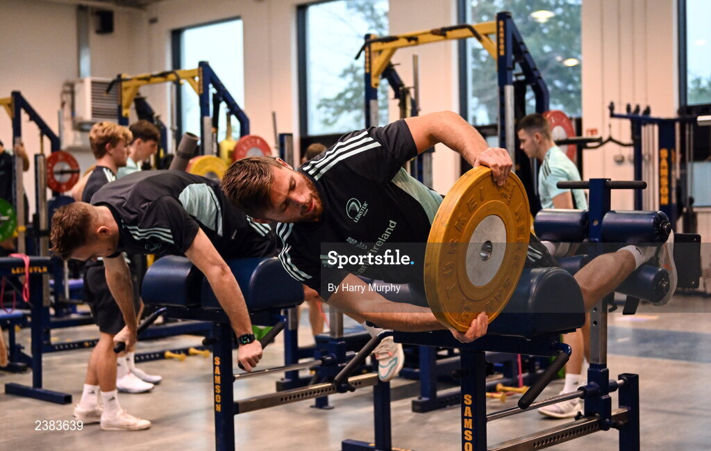 21 November 2022; Ross Byrne, right, during a Leinster Rugby gym session at Leinster HQ in Dublin. Photo by Harry Murphy/Sportsfile
