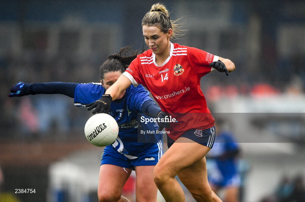 26 November 2022; Ailish Morrissey of Kilkerrin Clonberne in action against Michelle McGrath of Ballymacarbry during the CurrentAccount.ie LGFA All-Ireland Senior Club Championship Semi-Final match between Ballymacarbry, Waterford, and Kilkerrin Clonberne, Galway, at Fraher Field in Dungarvan, Waterford. Photo by Matt Browne/Sportsfile
