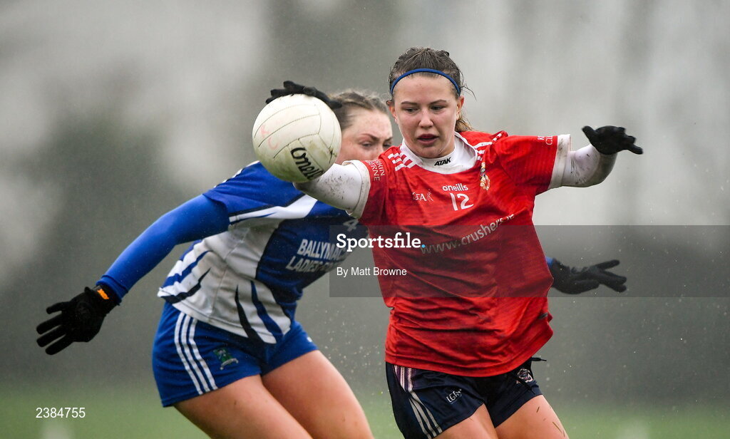 26 November 2022; Lynsey Noone of Kilkerrin Clonberne in action against Gretta Nugent of Ballymacarbry during the CurrentAccount.ie LGFA All-Ireland Senior Club Championship Semi-Final match between Ballymacarbry, Waterford, and Kilkerrin Clonberne, Galway, at Fraher Field in Dungarvan, Waterford. Photo by Matt Browne/Sportsfile