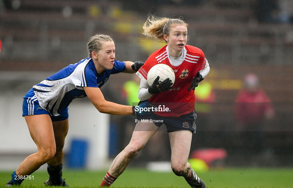 26 November 2022; Louise Ward of Kilkerrin Clonberne in action against Brid McMaugh of Ballymacarbry during the CurrentAccount.ie LGFA All-Ireland Senior Club Championship Semi-Final match between Ballymacarbry, Waterford, and Kilkerrin Clonberne, Galway, at Fraher Field in Dungarvan, Waterford. Photo by Matt Browne/Sportsfile