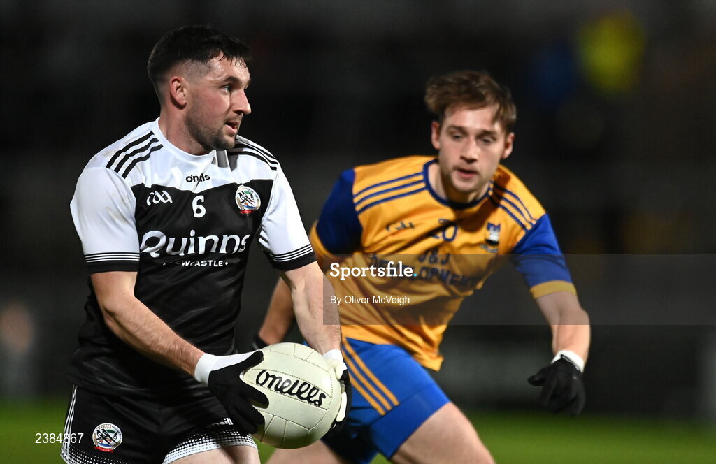 26 November 2022; Darryl Branagan of Kilcoo in action against Neil McDermott of Enniskillen Gaels during the AIB Ulster GAA Football Senior Club Championship Semi-Final match between Enniskillen Gaels and Kilcoo at Athletic Grounds in Armagh. Photo by Oliver McVeigh/Sportsfile