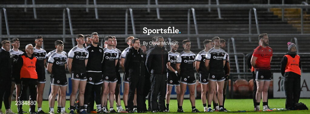 26 November 2022; The Kilcoo squad stand for a minutes silence before the AIB Ulster GAA Football Senior Club Championship Semi-Final match between Enniskillen Gaels and Kilcoo at Athletic Grounds in Armagh. Photo by Oliver McVeigh/Sportsfile