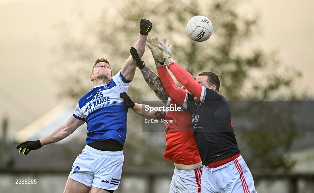 27 November 2022; Tommy Walsh of Kerins O'Rahillys scores his side's first goal despite the efforts of Aaron Fitzgerald, left, and Shane Daniels of Éire Óg Ennis during the AIB Munster GAA Football Senior Club Championship Semi-Final match between Kerins O’Rahillys and Éire Óg Ennis at Austin Stack Park in Tralee, Kerry. Photo by Eóin Noonan/Sportsfile