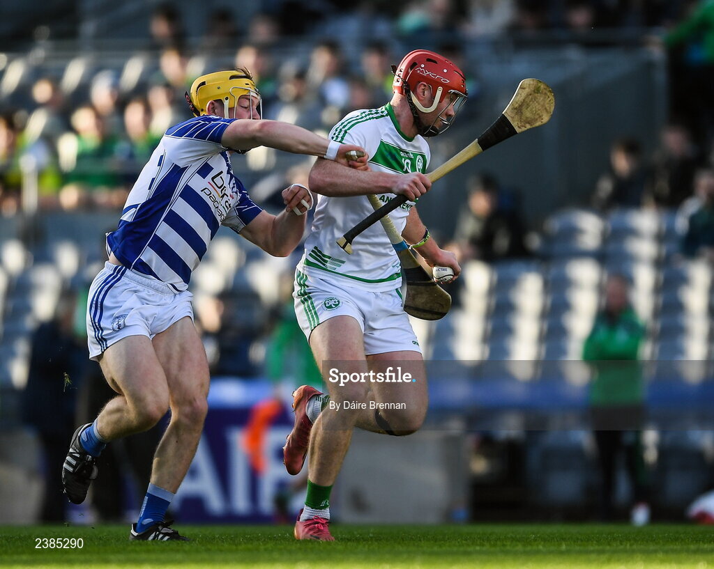 27 November 2022; Adrian Mullen of Shamrocks Ballyhale is tackled by Simon Leacy of Naas during the AIB Leinster GAA Hurling Senior Club Championship Semi-Final match between Naas and Shamrocks Ballyhale at Croke Park in Dublin. Photo by Daire Brennan/Sportsfile
