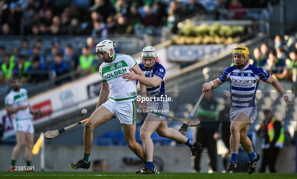 27 November 2022; Joey Cuddihy of Shamrocks Ballyhale in action against John McKeon and Simon Leacy of Naas during the AIB Leinster GAA Hurling Senior Club Championship Semi-Final match between Naas and Shamrocks Ballyhale at Croke Park in Dublin. Photo by Daire Brennan/Sportsfile
