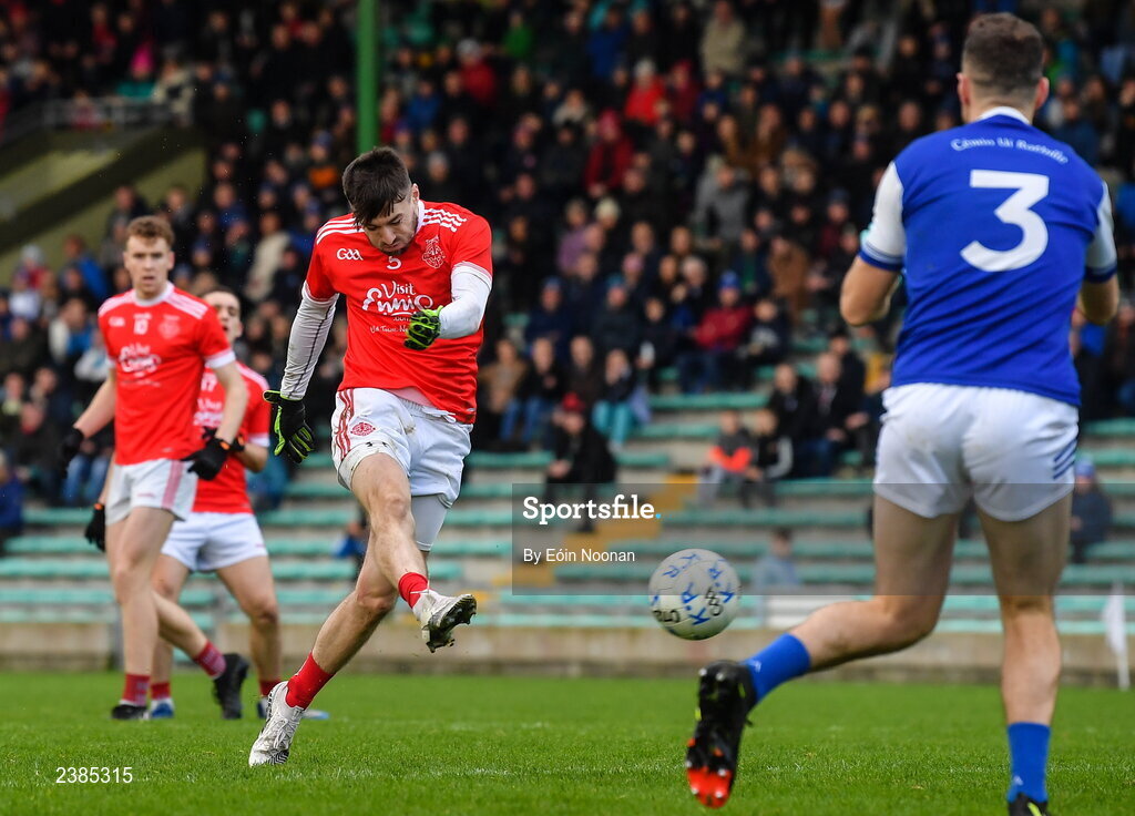 27 November 2022; Einne O'Connor of Éire Óg Ennis shoots to score his side's first goal during the AIB Munster GAA Football Senior Club Championship Semi-Final match between Kerins O’Rahillys and Éire Óg Ennis at Austin Stack Park in Tralee, Kerry. Photo by Eóin Noonan/Sportsfile