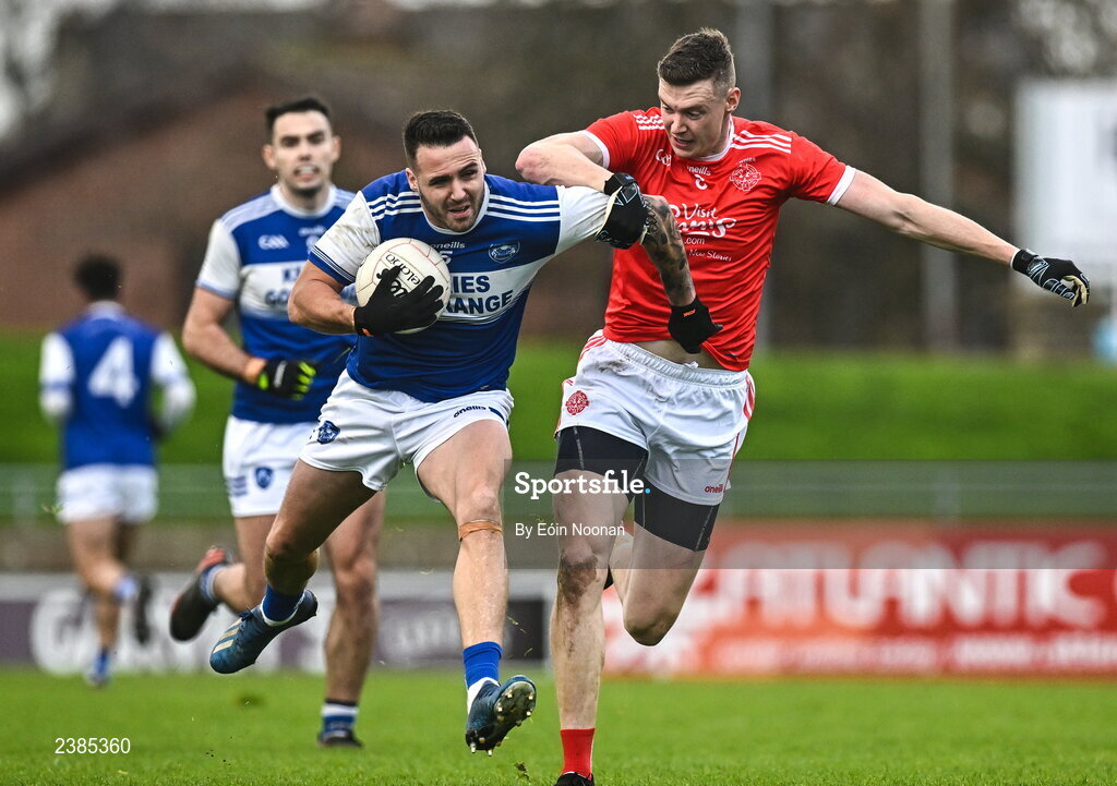 27 November 2022; Con Barrett of Kerins O'Rahillys in action against Darren O'Neill of Éire Óg Ennis during the AIB Munster GAA Football Senior Club Championship Semi-Final match between Kerins O’Rahillys and Éire Óg Ennis at Austin Stack Park in Tralee, Kerry. Photo by Eóin Noonan/Sportsfile