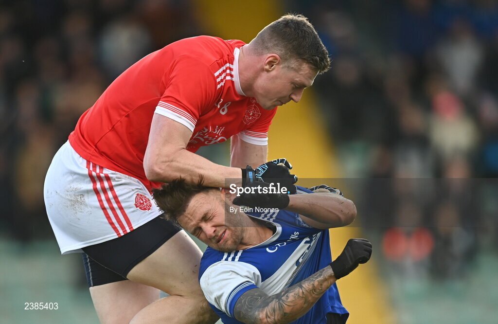 27 November 2022; Barry John Keane of Kerins O'Rahillys tussles with Darren O'Neill of Éire Óg Ennis during the AIB Munster GAA Football Senior Club Championship Semi-Final match between Kerins O’Rahillys and Éire Óg Ennis at Austin Stack Park in Tralee, Kerry. Photo by Eóin Noonan/Sportsfile