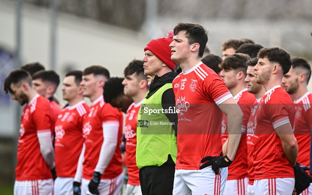 27 November 2022; Éire Óg Ennis manager Paul Madden stands with his players for the playing of Amhrán na bhFiann before the AIB Munster GAA Football Senior Club Championship Semi-Final match between Kerins O’Rahillys and Éire Óg Ennis at Austin Stack Park in Tralee, Kerry. Photo by Eóin Noonan/Sportsfile