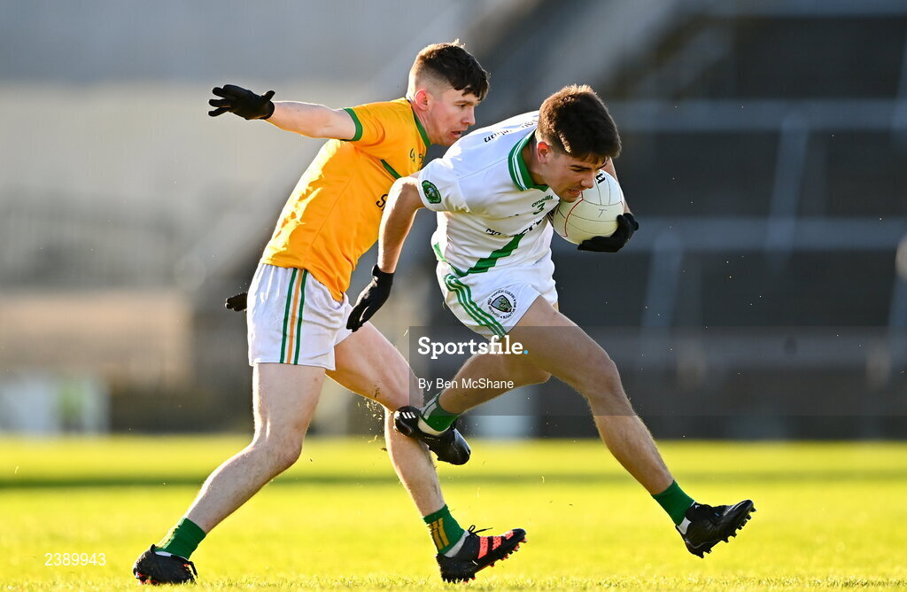 4 December 2022; Seán Kelly of Moycullen in action against John Francis Carr of Tourlestrane during the AIB Connacht GAA Football Senior Club Championship Final match between Moycullen of Galway and Tourlestrane of Mayo at Pearse Stadium in Galway. Photo by Ben McShane/Sportsfile