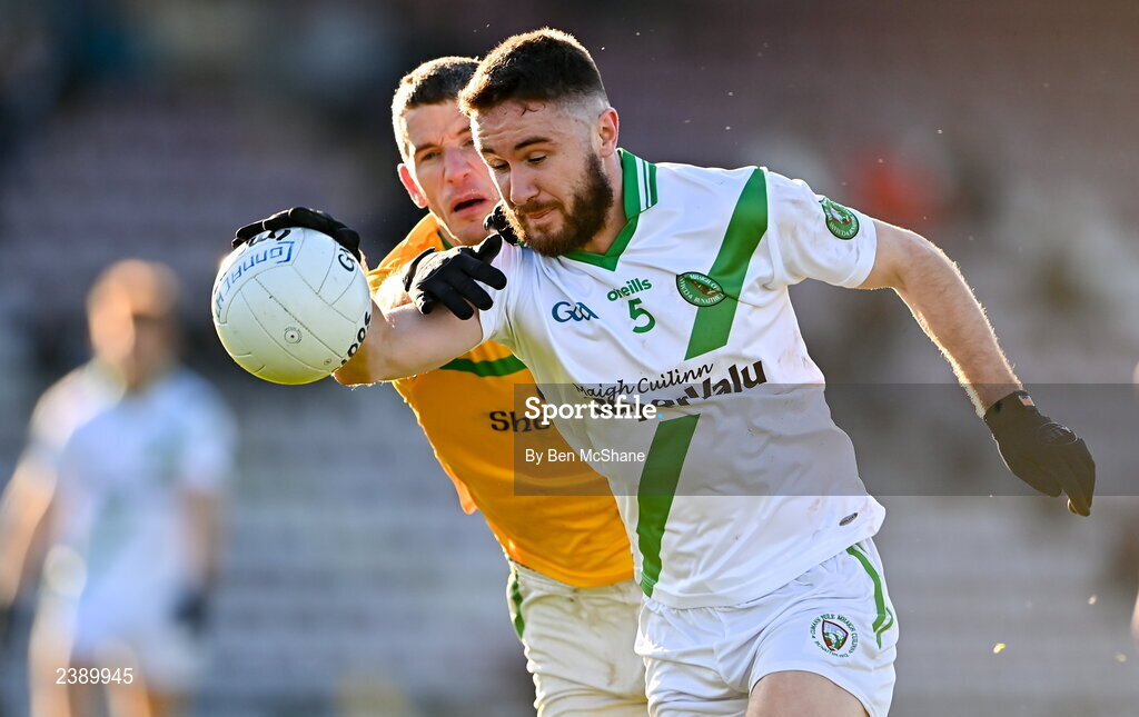 4 December 2022; Eoghan Kelly of Moycullen in action against Adrian McIntyre of Tourlestrane during the AIB Connacht GAA Football Senior Club Championship Final match between Moycullen of Galway and Tourlestrane of Mayo at Pearse Stadium in Galway. Photo by Ben McShane/Sportsfile