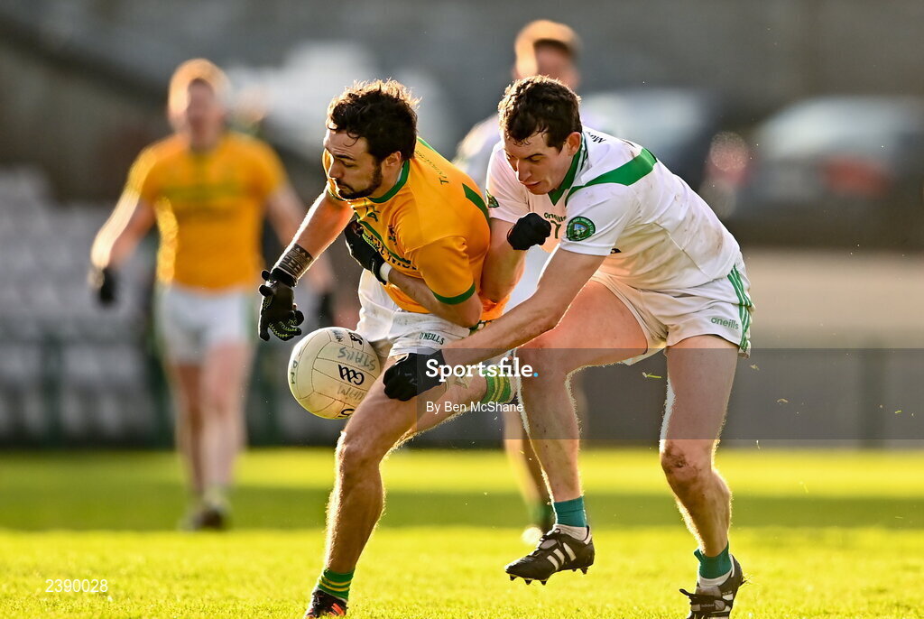 4 December 2022; John Kelly of Tourlestrane in action against Aidan Claffey of Moycullen during the AIB Connacht GAA Football Senior Club Championship Final match between Moycullen of Galway and Tourlestrane of Mayo at Pearse Stadium in Galway. Photo by Ben McShane/Sportsfile