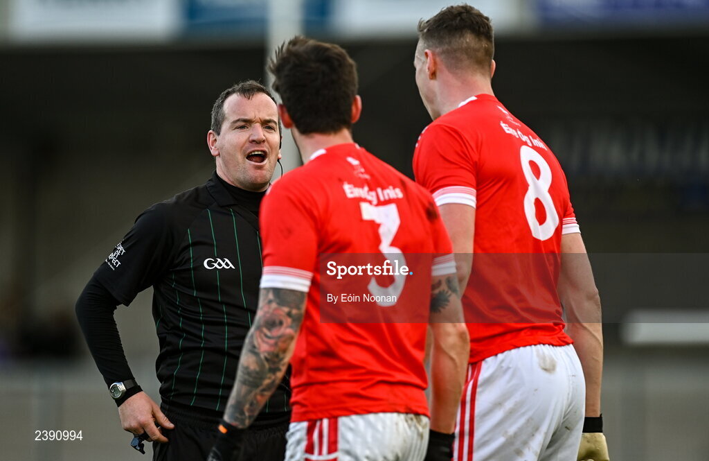27 November 2022; Referee Sean Lonergan with Éire Óg Ennis players during the AIB Munster GAA Football Senior Club Championship Semi-Final match between Kerins O’Rahillys and Éire Óg Ennis at Austin Stack Park in Tralee, Kerry. Photo by Eóin Noonan/Sportsfile