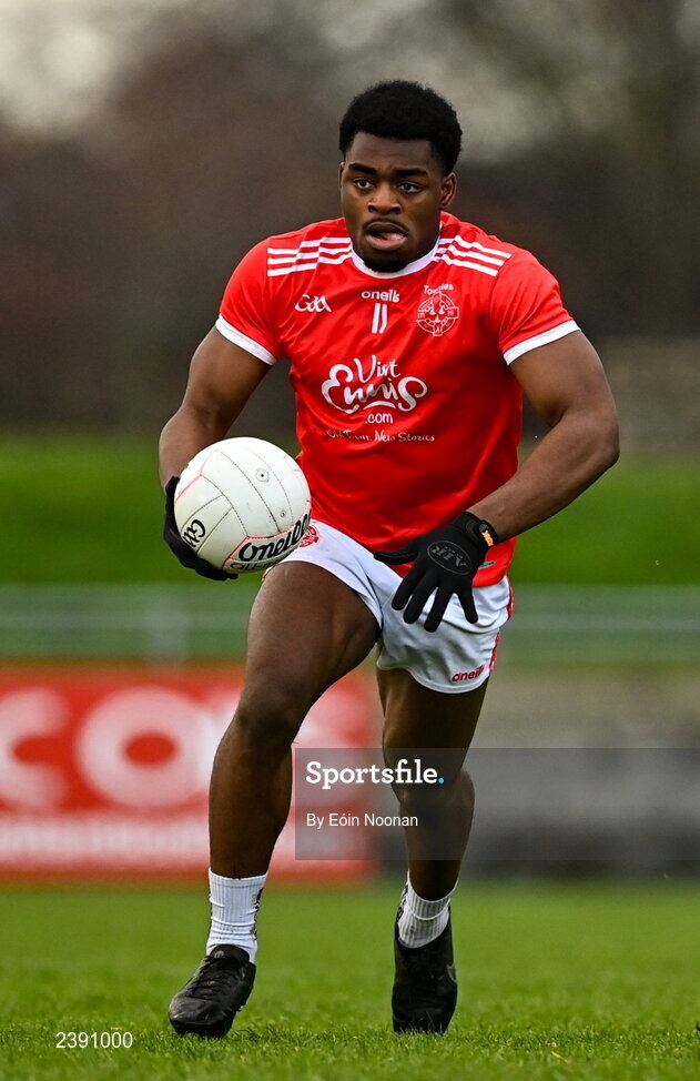 27 November 2022; Ikem Ugwueru of Éire Óg Ennis during the AIB Munster GAA Football Senior Club Championship Semi-Final match between Kerins O’Rahillys and Éire Óg Ennis at Austin Stack Park in Tralee, Kerry. Photo by Eóin Noonan/Sportsfile