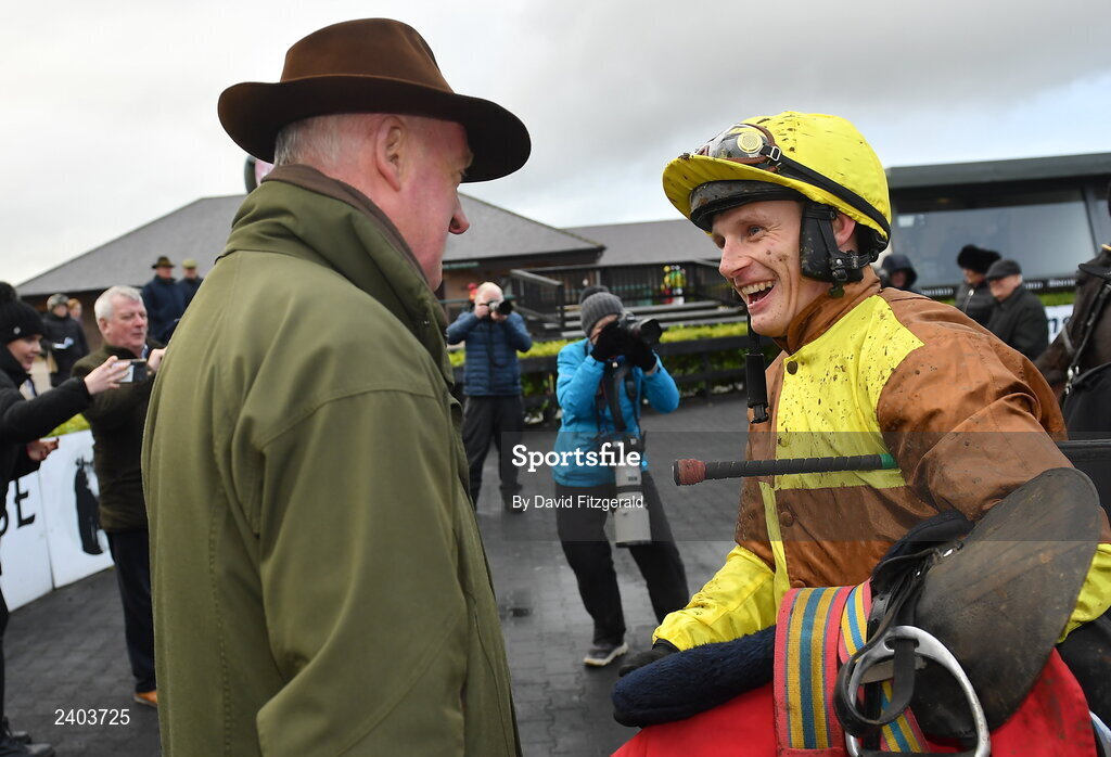 19 December 2022; Paul Townend with trainer Willie Mullins after winning the John Durkan Memorial Punchestown Steeplechase on Galopin Des Champs at Punchestown Racecourse in Naas, Kildare. Photo by David Fitzgerald/Sportsfile