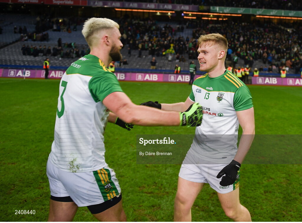 8 January 2023; Glen players, Ryan Dougan, left, and Alex Doherty celebrate after the AIB GAA Football All-Ireland Senior Club Championship Semi-Final match between Moycullen of Galway and Glen of Derry at Croke Park in Dublin. Photo by Daire Brennan/Sportsfile