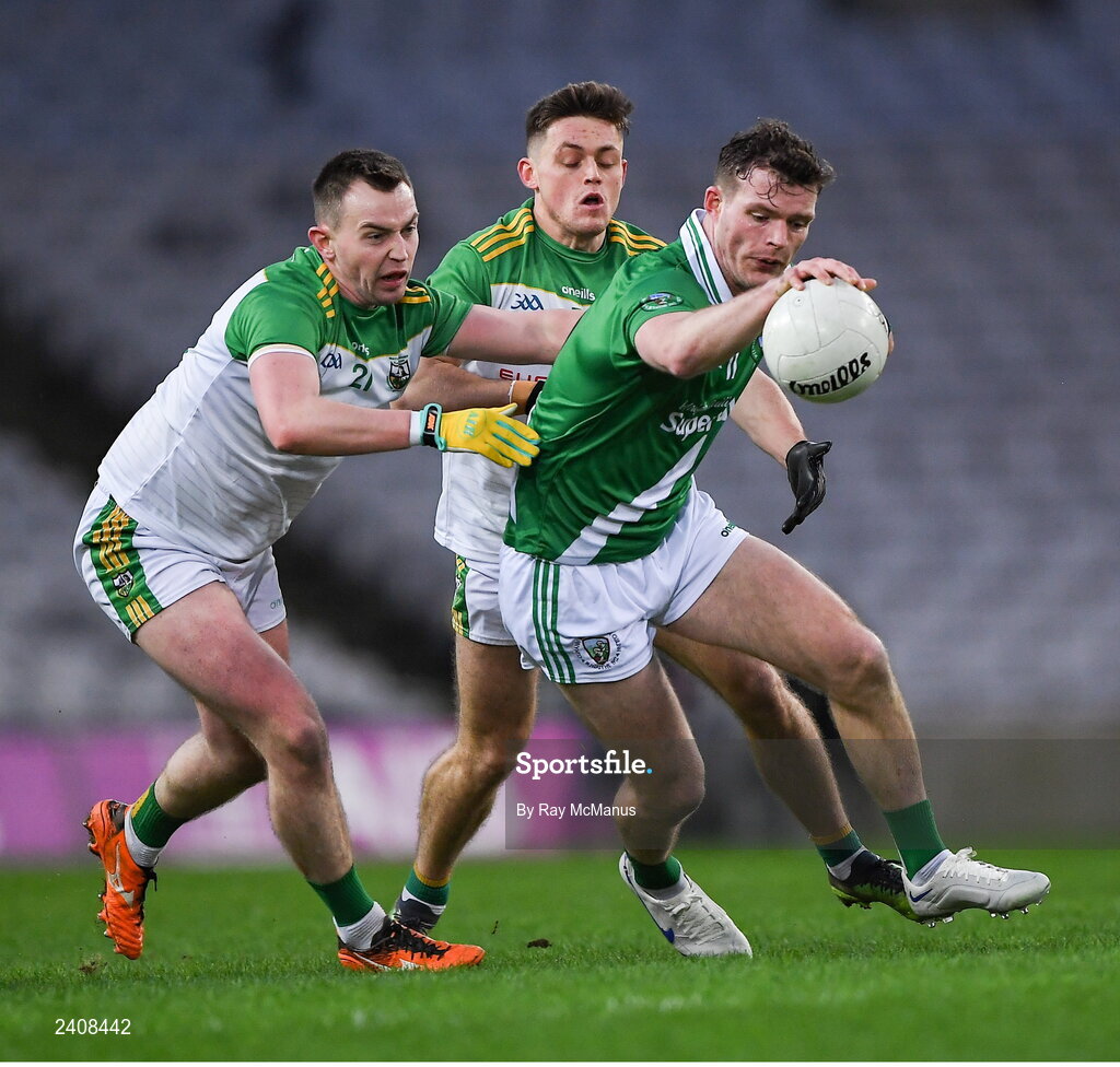 8 January 2023; Cowen Gallagher of Moycullen in action against Cahir McCabe and Eunan Mulholland of Glen during the AIB GAA Football All-Ireland Senior Club Championship Semi-Final match between Moycullen of Galway and Glen of Derry at Croke Park in Dublin. Photo by Ray McManus/Sportsfile