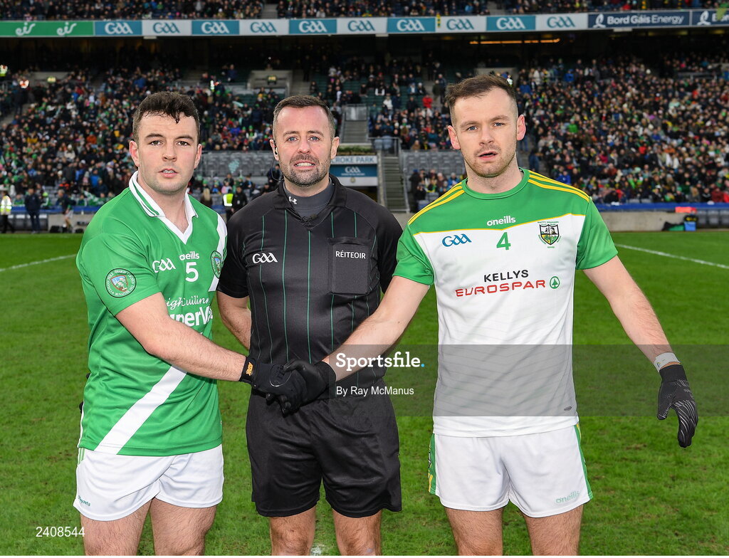 8 January 2023; Referee David Gough with the two captains, Dessie Conneely of Moycullen, left, and Connor Carville of Glen, before the AIB GAA Football All-Ireland Senior Club Championship Semi-Final match between Moycullen of Galway and Glen of Derry at Croke Park in Dublin. Photo by Ray McManus/Sportsfile