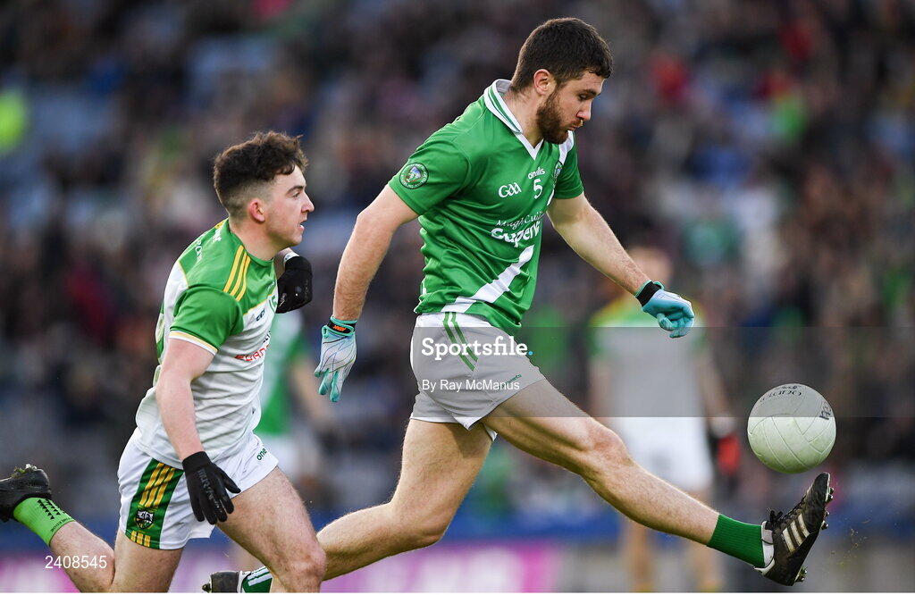 8 January 2023; Eoghan Kelly of Moycullen in action against Conleth McGuckian of Glen during the AIB GAA Football All-Ireland Senior Club Championship Semi-Final match between Moycullen of Galway and Glen of Derry at Croke Park in Dublin. Photo by Ray McManus/Sportsfile