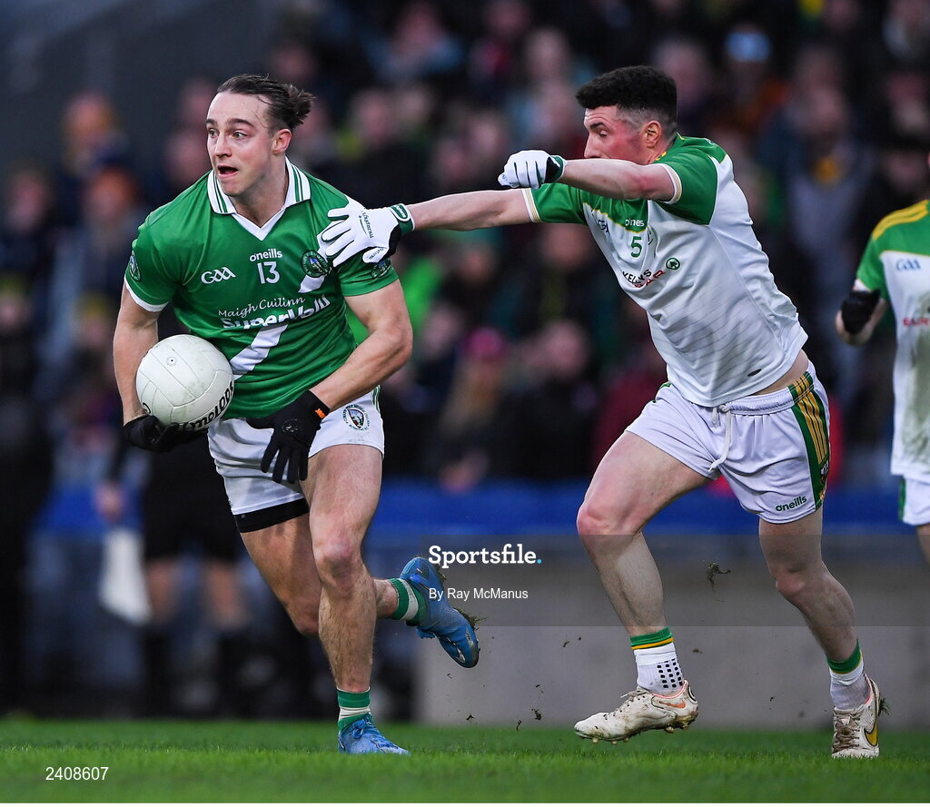 8 January 2023; Michéal O'Reilly of Moycullen in action against Tiernán Flannagan of Glen during the AIB GAA Football All-Ireland Senior Club Championship Semi-Final match between Moycullen of Galway and Glen of Derry at Croke Park in Dublin. Photo by Ray McManus/Sportsfile