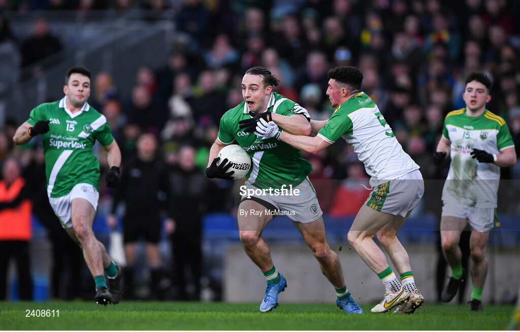8 January 2023; Michéal O'Reilly of Moycullen in action against Tiernán Flannagan of Glen during the AIB GAA Football All-Ireland Senior Club Championship Semi-Final match between Moycullen of Galway and Glen of Derry at Croke Park in Dublin. Photo by Ray McManus/Sportsfile