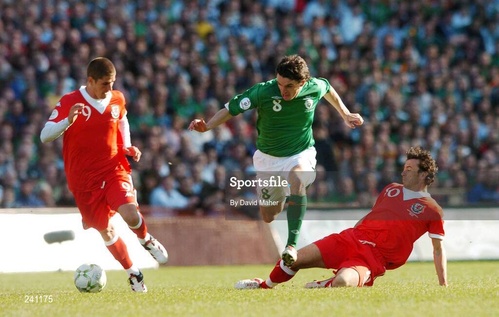 24 March 2007; Jonathan Douglas, Republic of Ireland, in action against Carl Robinson, left, and Simon Davis, Wales. 2008 European Championship Qualifier, Republic of Ireland v Wales, Croke Park, Dublin. Picture credit: David Maher / SPORTSFILE