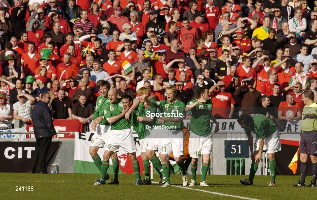 24 March 2007; Stephen Ireland, Republic of Ireland, celebrates infront of the Welsh fans on Hill 16 with his team-mates, from left to right, Kevin Kilbane, Lee Carsley, Paul McShane, Damien Duff and Robbie Keane, after scoring the opening goal of the game. 2008 European Championship Qualifier, Republic of Ireland v Wales, Croke Park, Dublin. Picture credit: Matt Browne / SPORTSFILE
