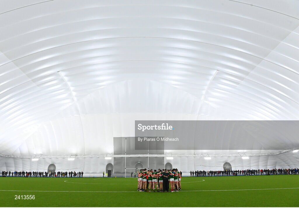 20 January 2023; Mayo players in a huddle before the Connacht FBD League Final match between Mayo and Roscommon at NUI Galway Connacht GAA Air Dome in Bekan, Mayo. Photo by Piaras Ó Mídheach/Sportsfile