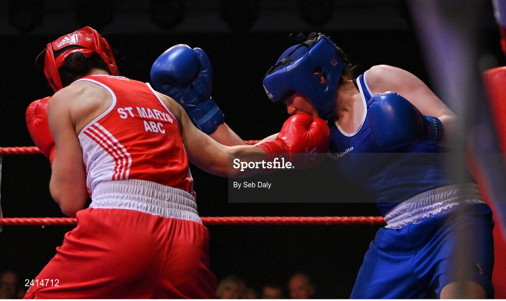 21 January 2023; Kellie Harrington of St Mary’s Boxing Club, Dublin, left, and Zara Breslin of Tramore Boxing Club, Waterford, during their lightweight 60kg final bout at the IABA National Elite Boxing Championships Finals at the National Boxing Stadium in Dublin. Photo by Seb Daly/Sportsfile