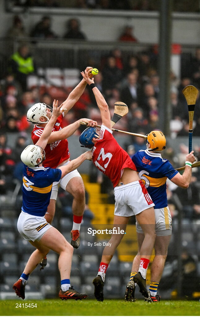 22 January 2023; Cork players Declan Dalton and Colin Walsh and Tipperary players Michael Breen and Pauric Campion challenge for the sliotar during the Co-Op Superstores Munster Hurling League Final match between Cork and Tipperary at Páirc Ui Rinn in Cork. Photo by Seb Daly/Sportsfile