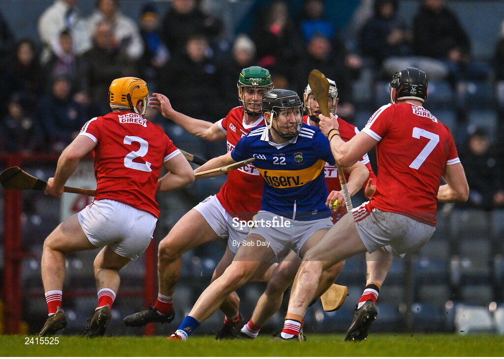 22 January 2023; Gearod O'Connor of Tipperary is surrounded by several Cork players during the Co-Op Superstores Munster Hurling League Final match between Cork and Tipperary at Páirc Ui Rinn in Cork. Photo by Seb Daly/Sportsfile