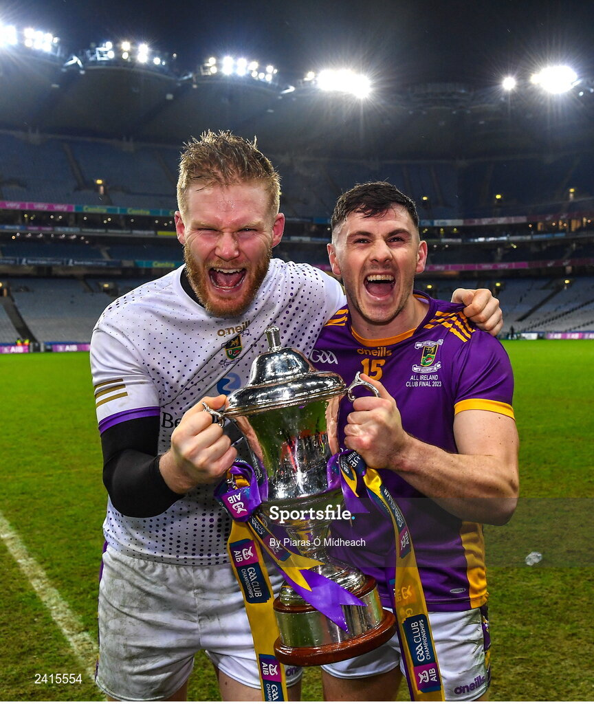 22 January 2023; Kilmacud Crokes goalkeeper Conor Ferris celebrates with the Andy Merrigan Cup and team-mate Shane Walsh after the AIB GAA Football All-Ireland Senior Club Championship Final match between Watty Graham's Glen of Derry and Kilmacud Crokes of Dublin at Croke Park in Dublin. Photo by Piaras Ó Mídheach/Sportsfile