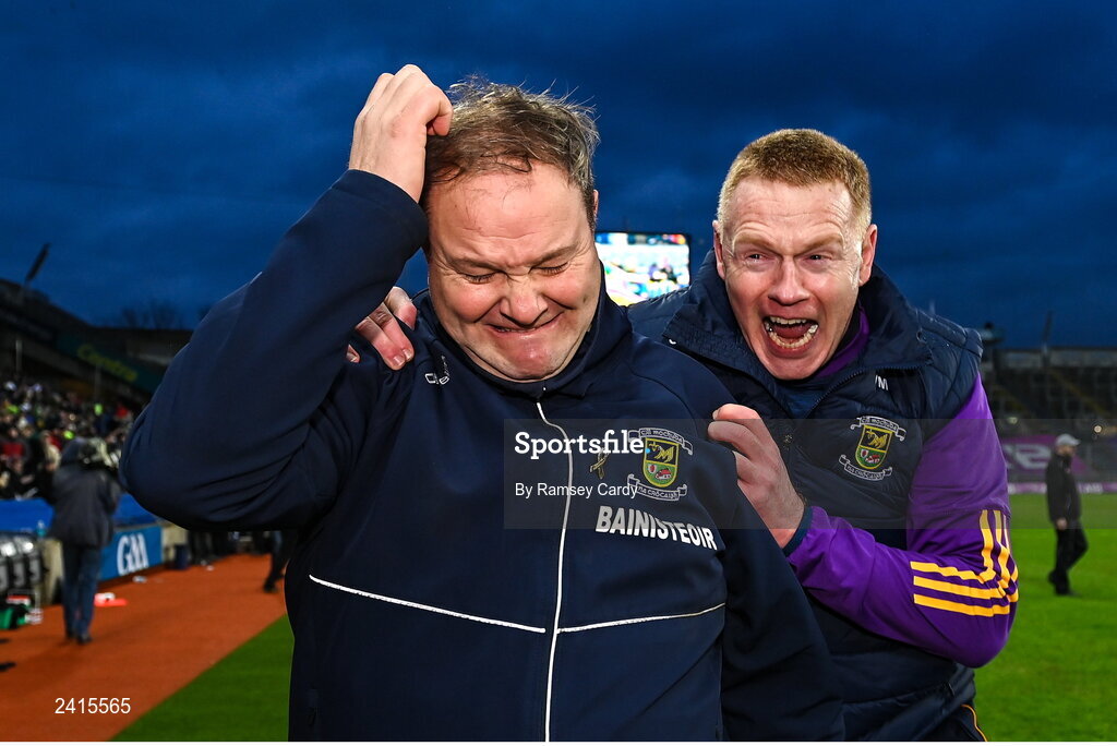 22 January 2023; Kilmacud Crokes manager Robbie Brennan, left, and selector Vinny Mooney celebrate at the final whistle of the AIB GAA Football All-Ireland Senior Club Championship Final match between Watty Graham's Glen of Derry and Kilmacud Crokes of Dublin at Croke Park in Dublin. Photo by Ramsey Cardy/Sportsfile