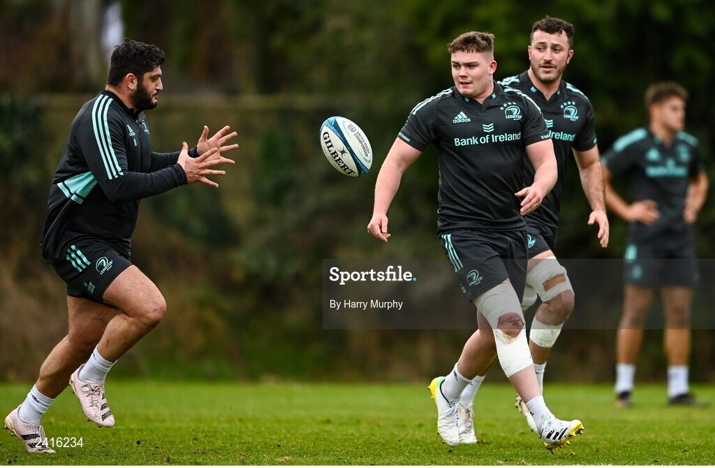23 January 2023; Jack Boyle offloads to Vakhtang Abdaladze during a Leinster Rugby squad training session at UCD in Dublin. Photo by Harry Murphy/Sportsfile