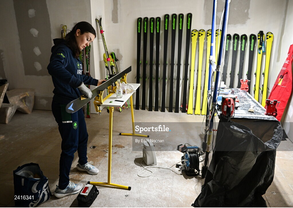 24 January 2023; Team Ireland alpine skier Eábha McKenna preparing her skis before the 2023 Winter European Youth Olympic Festival at Friuli-Venezia Giulia in Udine, Italy. Photo by Eóin Noonan/Sportsfile