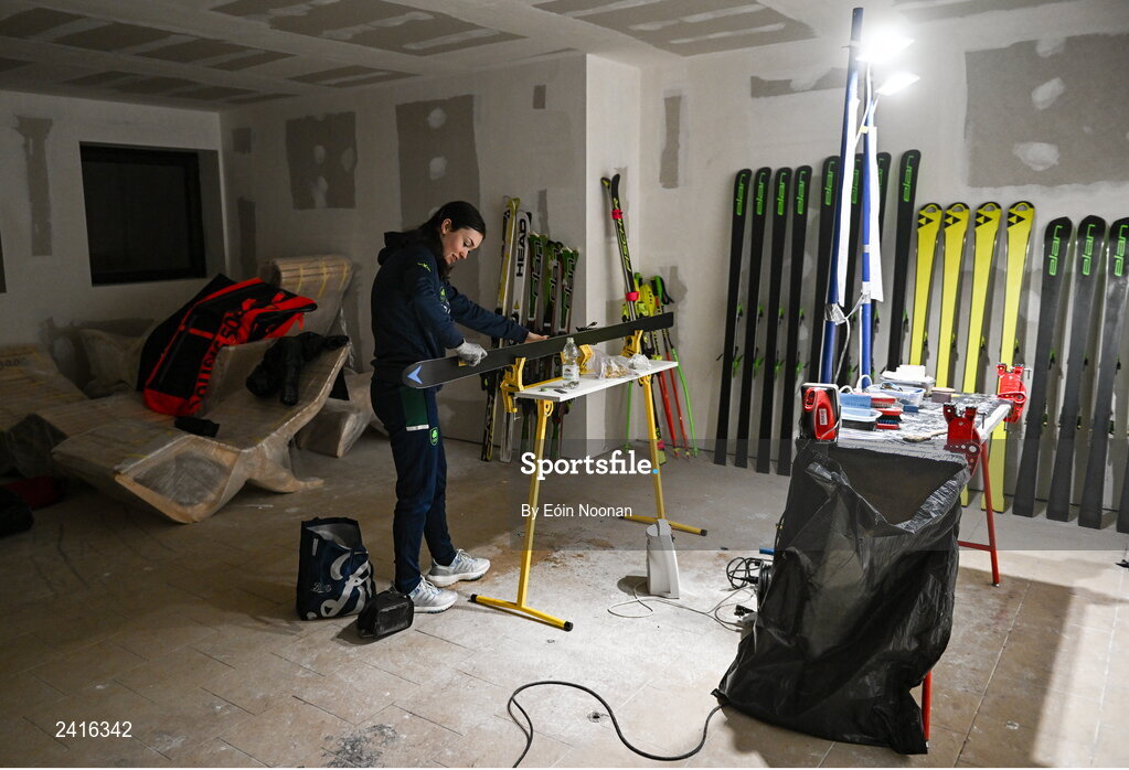 24 January 2023; Team Ireland alpine skier Eábha McKenna preparing her skis before the 2023 Winter European Youth Olympic Festival at Friuli-Venezia Giulia in Udine, Italy. Photo by Eóin Noonan/Sportsfile