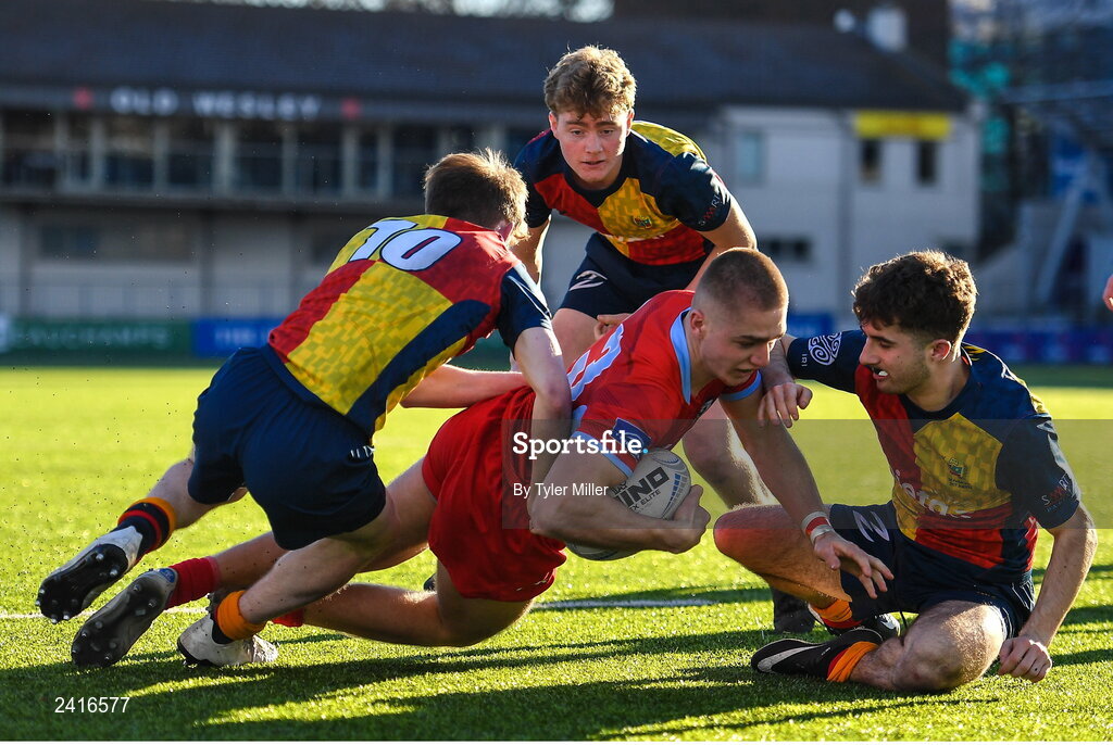 24 January 2023; Rian Tracey of CUS is tackled by Cillian Cleary of St Fintans High School, left, during the Bank of Ireland Vinnie Murray Cup Semi-Final match between St Fintans High School and CUS at Energia Park in Dublin. Photo by Tyler Miller/Sportsfile