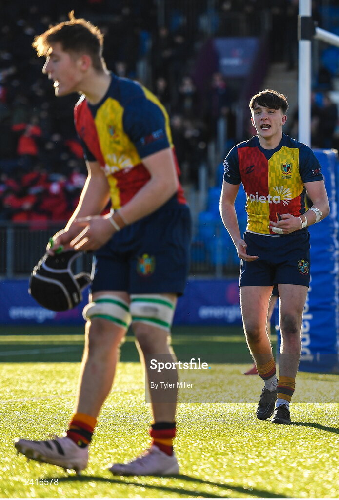 24 January 2023; Conor Cribbin of St Fintans High School issues instructions to his teammates after they concede a try during the Bank of Ireland Vinnie Murray Cup Semi-Final match between St Fintans High School and CUS at Energia Park in Dublin. Photo by Tyler Miller/Sportsfile
