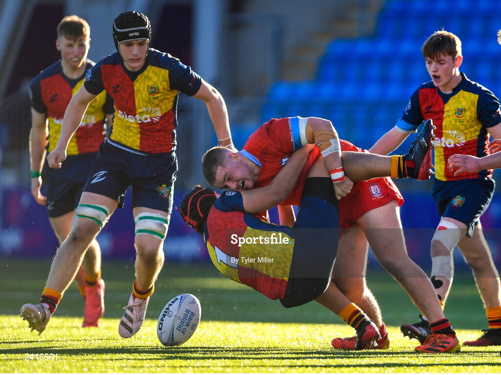 24 January 2023; Ponamu Palazzetti of St Fintans High School is tackled by Aidan Walsh of CUS during the Bank of Ireland Vinnie Murray Cup Semi-Final match between St Fintans High School and CUS at Energia Park in Dublin. Photo by Tyler Miller/Sportsfile