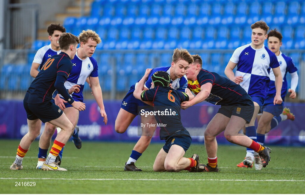 24 January 2023; Rocco Hill of St Andrew's College in action against Nathan Griffiths of Temple Carrig during the Bank of Ireland Vinnie Murray Cup Semi-Final match between Temple Carrig and St Andrews College at Energia Park in Dublin. Photo by Tyler Miller/Sportsfile