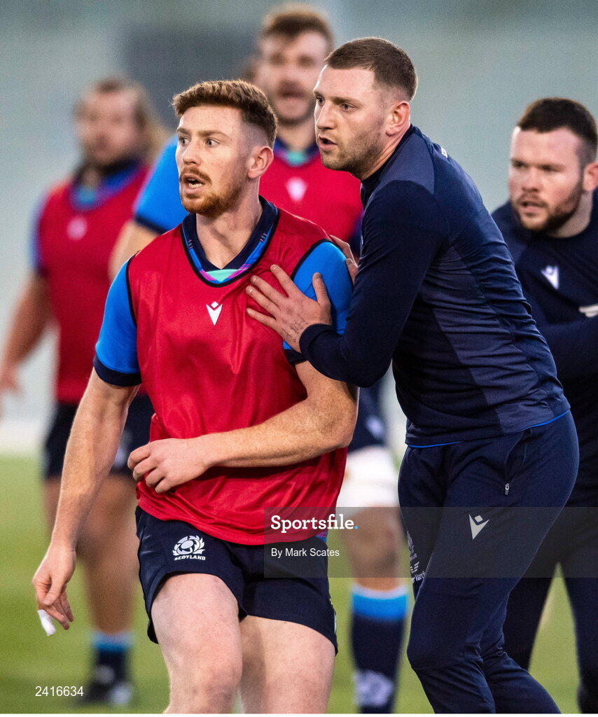 24 January 2023; Ben Healy, left, and Finn Russell during Scotland rugby squad training at Oriam in Edinburgh, Scotland. Photo by Mark Scates/Sportsfile