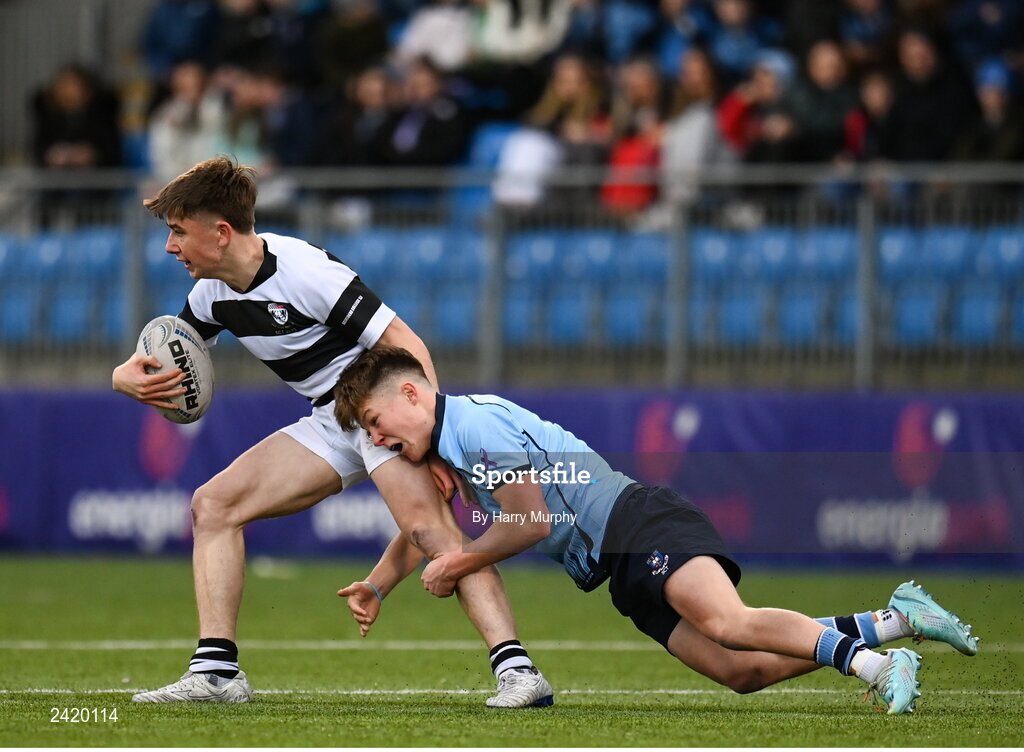 29 January 2023; Jack Dunne of Belvedere College is tackled by James Sherwin of St Michael's College during the Bank of Ireland Leinster Rugby Schools Senior Cup First Round match between St Michael’s College and Belvedere College at Energia Park in Dublin. Photo by Harry Murphy/Sportsfile