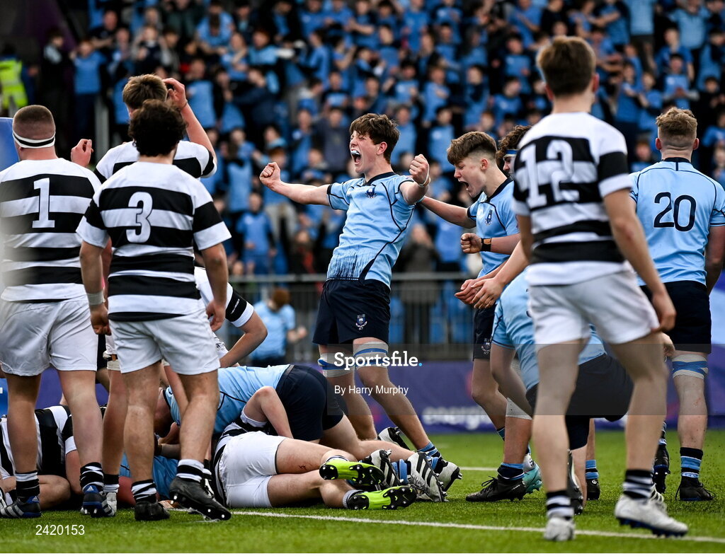 29 January 2023; David Walsh of St Michael's College celebrates his side's first try during the Bank of Ireland Leinster Rugby Schools Senior Cup First Round match between St Michael’s College and Belvedere College at Energia Park in Dublin. Photo by Harry Murphy/Sportsfile